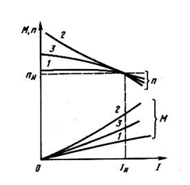 Рис. 4.37 Сравнительные скоростные и механические характеристики ДПТ На рис. 4.37 показаны сравнительные скоростные и механические характеристики ДПТ (1- последовательного возбуждения; 2- смешанного возбуждения; 3- параллельного возбуждения).