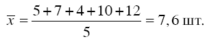 Самый распространенный вид средней величины – средняя арифметическая. Под средней арифметической понимается такое значение признака, которое имела бы каждая единица совокупности, если бы общий итог всех значений признака был распределен равномерно между всеми единицами совокупности. Вычисление данной величины сводится к суммированию всех значений варьирующего признака и делению полученной суммы на общее количество единиц совокупности. Например, пять рабочих выполняли заказ на изготовление деталей, при этом первый изготовил 5 деталей, второй – 7, третий – 4, четвертый – 10, пятый– 12. Поскольку в исходных данных значение каждого варианта встречалось только один раз, для определения средней выработки одного рабочего следует применить формулу простой средней арифметической: