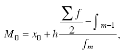 Где X0 – нижняя граница интервала; h – величина интервала; fm – частота интервала; f – число членов ряда;?m -1 – сумма накопленных членов ряда, предшествующих данному.