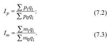Формула (7.2) представляет собой сводный индекс цен, а формула (7.3) – расчет сводного индекса расхода материалов. В этих индексах разность между числителем и знаменателем характеризует в первом случае уменьшение либо увеличение затрат на приобретение одного и того же набора товаров в зависимости от знака разности; во втором случае – увеличение или уменьшение расхода материалов на производство одного и того же объема продукции.