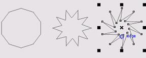 4. Обратите внимание на узлы построенного многоугольника. Выберите инструмент Shape (Форма) и наведите его указатель на любой из узлов, расположенных в серединах сторон многоугольника. Удерживая нажатой клавишу Ctrl, перетащите этот узел по радиусу примерно на половину расстояния до центра. Вместе с «захваченным» узлом будут перемещаться и все остальные дополнительные узлы, размещенные в серединах сторон многоугольника. В результате получится фигура, похожая на метательное оружие ниндзя — сюрикен (рис.9, в середине).