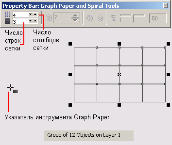 Постройте сетку, не меняя принятых по умолчанию значений управляющих параметров, и обратите внимание на сообщение в строке состояния: Group of 12 Objects on Layer 1 (Группа из 12 объектов на слое 1). Построенная сетка утрачивает связь с инструментом Graph Paper (Диаграммная сетка), и воспользоваться им для ее модификации не удастся.