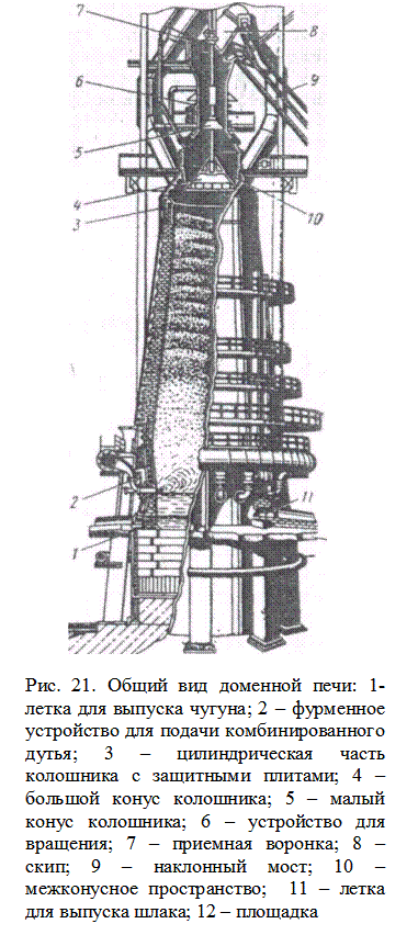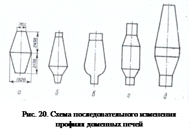 На рис. 20 показаны схемы профиля печей, дающие представление об их изменении за последние столетия: от простейших типа домниц (а) с постепенным переходом (б, в, г) к современному (д). Процесс доменной плавки – непрерывный. Сверху в печь загружают сырые материалы (офлюсованный агломерат, кокс), а в нижнюю через фурмы подают нагретое дутье (воздух, обогащенный кислородом) и газообразное, жидкое или пылевидное топливо.
