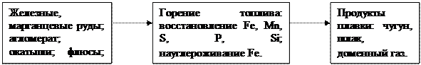 Полученные от сжигания топлива газы проходят через столб шихты, отдавая ей свою химическую и тепловую энергию. Опускающаяся рудная шихта нагревается, восстанавливается и расплавляется. Часть кокса расходуется в печи на восстановление железа и других элементов, а большое его количество сгорает в зоне фурм. Ровное, быстрое опускание шихты и хорошее взаимодействие с газами, т. е. лучшее использование тепловой и химической энергии газового потока, являются важнейшими факторами в доменном производстве. Схематически доменный процесс можно представить в следующем виде: