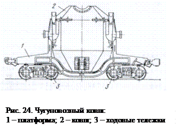 Из цеха чугун перевозится в футерованных ковшах грушевидной формы емкостью 140 - 300 т. Схема ковша представлена на рис. 24. При перевозке чугуна на далекое расстояние используют ковши миксерного типа удлиненной цилиндрической формы емкостью до 600 т. Длина такого ковша емкостью 420 т равна 32 м, ширина 3,7 м. Жидкий чугун можно перевозить на расстояние до 300 км. Среднее понижение температуры металла в таком чугуновозе 5оС/час. Такие перевозки происходят, например, между Западно-Сибирским и Кузнецким металлургическими комбинатами.