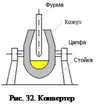 Конвертер (рис. 32) представляет собой стальной сосуд грушевидной формы. Внутренняя часть футерована огнеупорным материалом. Конвертер цапфами опирается на стойки и имеет возможность поворачиваться при заливке жидкого чугуна, выпуске стали и шлака.