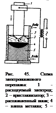 Особенность ЭШП состоит в том, что это бездуговой процесс, а расходуемый электрод переплавляют в водоохлаждаемом кристаллизаторе под слоем шлака. На рис. 45 показана принципиальная схема установки ЭШП. Нагрев жидкого электропроводного шлака до 2000оС при прохождении тока обеспечивает плавление погруженного в него электрода.