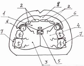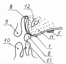Учитывая, что давление, оказываемое губой на альвеолярный отросток во время глотания и речи так же, как и искусственная десна могут задержать рост челюсти, целесообразно применять устройство (Рис.), включающее нёбную пластинку с искусственными резцами (2), поставленными по ортогнатическому соотношению с антагонистами (13), винт (5), кламмеры (6,7). При этом нёбная пластинка разделена на передний (1) и боковые (3,4) сегменты, которые при расширении винта Бертони (5) перемещаются отдельно друг от друга в сагиттальном и трансверзальном направлениях. А в области дефекта зубного ряда по гребню альвеолярного отростка с передним сегментом соединен губной щит (8), отодвигающий губы (9, 10) от поверхности десны на 1,0-2,0 мм. Щит устраняет западение верхней губы, нормализует смыкание губ. Свободный край губного щита закруглен, повторяет контуры переходной складки, обходит уздечку верхней губы и слизистые тяжи и продолжается до уровня расположения первых временных моляров. При смыкании губ натягиваются мягкие ткани в области основания альвеолярного отростка (11), вследствие чего активизируется рост переднего отдела верхней челюсти, постоянные резцы (12) прорезываются в правильном положении. Увеличение размеров апикального базиса исключает возможность рецидива деформации верхней зубной дуги.