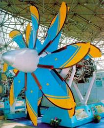 Высокоэффективный закапотирован- ный соосный флюгерно-реверсивный винтовентилятор СВ-92 с композитными лопастями умеренной саблевид- ности для перспективного газотурбинного двигателя со сверхвысокой степенью двухконтурности НК-93. Взлетная тяга 20000 кгс при мощности на валу 30000 л.с.