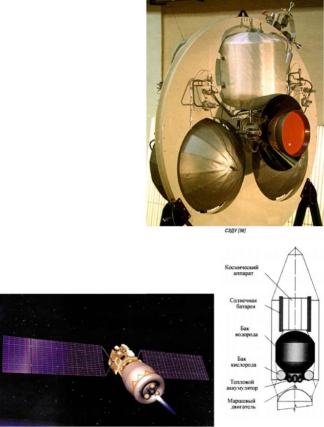В СЭДУ входит солнечный тепловой ракетный двигатель (СТРД). СТРД - это экологически чистый двух- режимный двигатель с электронагрев- ным тепловым аккумулятором (ТА), работающий как на горячем водороде, так и при дожигании горячего водорода с кислородом. Нагрев ТА осуществляется электроэнергией от солнечных батарей космического аппарата. ТА обеспечивает импульсный режим работы двигателя и реализацию энергетически оптимальных многоимпульсных схем выведения КА на рабочие орбиты.