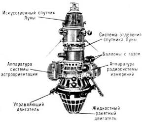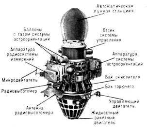 Сферический бак окислителя является силовым элементом ДУ. К нему крепится торовый бак горючего. ЖРД снабжен неподвижными рулевыми соплами, работающими на генераторном газе. Имеются сферические баллоны с газообразным гелием, использующиеся для наддува баков и управления агрегатами автоматики ДУ. В полете ДУ включается дважды: для коррекции траектории КА и для торможения его вблизи Луны с целью осуществления мягкой посадки или вывода искусственного спутника Луны. Начальное поступление топлива в ЖРД без газовых включений обеспечивается установленными в баках металлическими сетчатыми разделителями, действие которых основано на эффекте поверхностного натяжения жидкости в мелких ячейках. При запуске ЖРД камера сгорания наддувается гелием с целью создания в ней давления, необходимого для нормального воспламенения топлива.