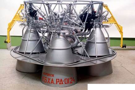 Спроектирован по схеме с дожиганием окислительного генераторного газа и имеет больший удельный импульс тяги, что позволяет выводить на орбиту большие по массе (на 950 кг) полезные грузы, а также обеспечивать запуски РН "Союз-2" с космодромов, расположенных севернее Байконура. Двигатель РД-0124 включает в себя четыре камеры сгорания, газогенератор, систему подачи компонентов топлива (ТНА, бустерные насосные агрегаты горючего и окислителя), систему запуска и выключения, систему регулирования и управления, систему наддува баков ракеты, систему подачи горючего к рулевым машинам. Воспламенение топлива при запуске обеспечивается пусковым горючим. Управление агрегатами автоматики производится пиросредствами, ракетоносителем в полете - отклонением камер, каждой в одной плоскости. С 1996 г. успешно ведутся огневые до- водные испытания.