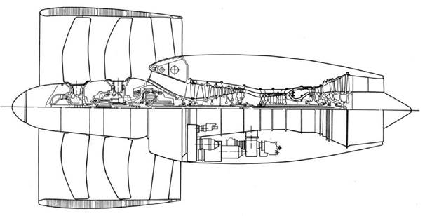 Двигатель имеет двухрядный винто- вентилятор с поворотными лопастями. Винтовентилятор приводится во вращение от трехступенчатой турбины через планетарно-дифференци- альный редуктор. При этом 40% мощности, передаваемой через редуктор, приходится на восьмилопастную ступень, а 60% - на десятилопастную. Ступени вращаются в противоположные стороны.