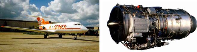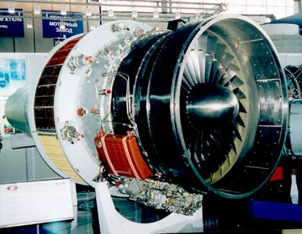 Д-36 включает в себя одноступенчатый трансзвуковой вентилятор с 29 титановыми лопатками ротора (n = 5400 об./мин.), шестиступенчатый компрессор низкого давления с нерегулируемым ВНА (титановые диски и лопатки ротора и стальные лопатки статора, n = 10500 об./мин.), семисту- пенчатый компрессор высокого давления с регулируемым ВНА (диски и лопатки последних двух ступеней стальные, n = 14170 об./мин.), кольцевую камеру сгорания с 24 форсунками, одноступенчатую турбину высокого давления (конвекционно-пленочная система охлаждения), одноступенчатую неохлаждаемую турбину низкого давления, трехступенчатую турбину вентилятора (охлаждаемые воздухом диски) и выходного устройства (кожух заднего подшипника и сопло). Для повышения надежности Д-36 в его узлах реализованы такие прогрессивные технические решения, как вентиляторные лопатки с высоким к.п.д. и повышенной прочностью, способные в полете выдерживать удары от попадания птиц, непробиваемый корпус вентилятора, упроченный композиционными материалами, упруго-масляные демпферы подшипниковых опор, электронно-лучевая сварка роторов и другие. Двигатель имеет узлы универсальной подвески, которая позволяет устанавливать его на пилоне сверху или снизу крыла, в фюзеляже, на левом и пра
