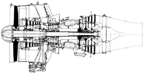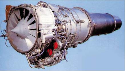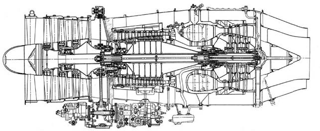 нению с базовым этот двигатель имеет увеличенную на 15% тягу, повышенные степень сжатия и температуру газа перед турбиной, дополнительную ступень компрессора высокого давления, охлаждаемую ступень турбины. Двигатель оборудован противо- обледенительным устройством, специальной системой смазки подшипников для выполнения перевернутого полета, воздушной системой запуска раздельными соплами внешнего и внутреннего контуров. Доработаны коробка приводов и разделительный корпус.