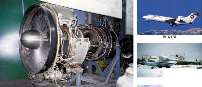 В середине 70-х гг. впервые в практике отечественного авиадвигателестро- ения был разработан проект турбореактивного двигателя Д-36 с высокой степенью двухконтурности. Стендовые испытания начаты в 1971 г., летные - в 1974 г. Поступил в серийное производство в 1977 г. За участие в создании Як-42 заместителю главного конструктора А.П. Щелоку присуждена Государственная премия СССР. Конструкция Д-36 выполнена по трех- вальной схеме с широким использованием титана и применением принципа модульности, что позволяет производить замену отдельных модулей двигателя непосредственно в эксплуатации. Модули двигателя: колесо вентилятора, спрямляющий аппарат вентилятора, вал вентилятора, компрессор низкого давления, коробка приводов, задняя опора, турбина вентилятора, ротор турбины низкого давления, корпус опоры турбины, ротор турбины высокого давления, камера сгорания, промежуточный корпус в сборе с компрессором высокого давления. В конструкции используются всего шесть подшипников. Межвальные подшипники исключены.