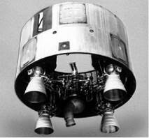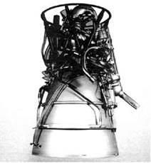 Для управления вектором тяги по каналам тангажа и рыскания применен газодинамический способ, основанный на вдуве восстановительного генераторного газа в сверхзвуковую часть сопла камеры двигателя через нормально закрытые газораспределители. Двигатель имеет систему поддержания давления в камере сгорания и систему регулирования весового соотношения компонентов топлива. Двигатель разработан в 1969-72 гг. Компоненты топлива - тетраоксид азота (окислитель) и НДМГ (горючее) Рп = 14544 кгс (142,63 кН) 1п = 331 с рк = 13,24 МПа Ра = 8,83 кПа Кт = 2,55