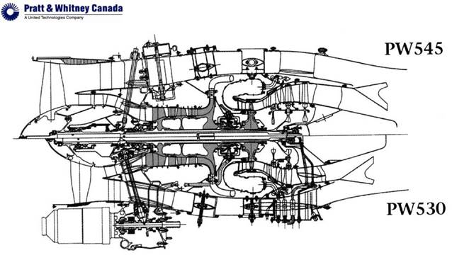 Двигатели семейства PW500 с высокой степенью двухконтурности развивают тягу в пределах 1360... 1815 кгс. По сравнению с JT15D данный двигатель имеет на 12...15% меньший удельный расход топлива.
