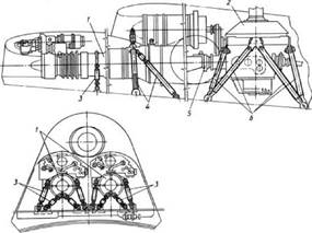 1 - двигатели; 2 - редуктор; 3 - стойки крепления двигателя в передней его части; 4 - приспособление для удержания двигателя при снятии редуктора с вертолета; 5 - сферическая опора редуктора для крепления двигателя в передней его части; 6 - подкосы рамы крепления редуктора