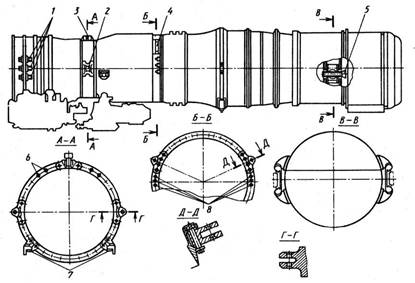1, 6, 8 - болты; 2 - передние боковые кронштейны; 3 - верхний узел крепления; 4 - задние боковые кронштейны; 5 - опоры форсажной камеры; 7 - кронштейны