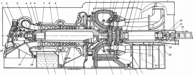 - направляющий лопаточный аппарат; 7 - рабочие лопатки; 8 - корпус (средняя часть); 9 - ротор турбокомпрессора; 10 - трубопровод охлаждения; 11 - корпус турбины; 12 - опорный вкладыш; 13 - диафрагма с уплотнением; 14 - диск и рабочи лопатки компрессорной турбины; 15 - обойма с направляющими лопатками; 16 - диск и рабочие лопатки силовой турбины; 17 - выходной диффузор; 18 - опорный вкладыш; 19 - вал ротора силовой турбины; 20 - выхлопной патрубок; 21 - декоративная обшивка; 22 - импеллер; 23 - корпус подшипников; 24 - зубчатая муфта; 25 - опорно-упорный вкладыш; 26 - рама; 27 - воздушный трубопровод; 28 - стяжка; 29 - шпонка; 30