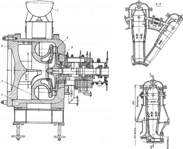 1 - главный масляный насос; 2 - валоповоротное устройство; 3 - опорно-упорный вкладыш; 4 - хвостовик вала; 5 - входной патрубок; 6