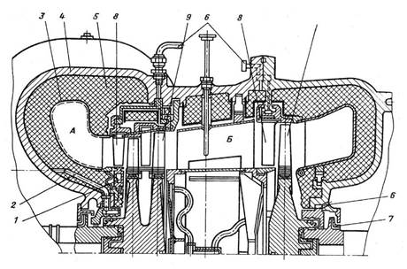 1 - воздухоподводящая камера; 2, 6 - каналы для подвода охлаждающего воздуха; 3 - внутренний корпус; 4 - внешний корпус; 5 - изоляция; 7 - центробежное колесо; 8 - направляющие лопатки; 9 - рабочие лопатки