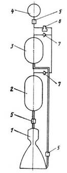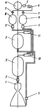 1 - камера; 2 - бак окислителя; 3 - бак горючего; 4 - баллон с газом; 5 - пускоотсечной клапан; 6 - газовый редуктор давления; 7 - обратный клапан; 8 - бак окислителя ЖГГ; 9 - бак горючего ЖГГ; 10 - ЖГГ наддува бака окислителя; 11 - ЖГГ наддува бака горючего