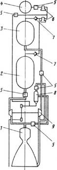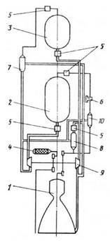 1 - камера; 2 - бак окислителя; 3 - бак горючего; 4 - пиростартер; 5 - пускоотсечной клапан; 6 - газовый редуктор давления; 7 - ЖГГ наддува бака горючего; 8 - ЖГГ; 9 - ТНА; 10 - смеситель