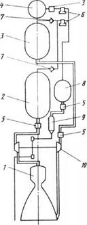 1 - камера; 2 - бак окислите- 1 - камера; 2 - бак окислителя; 3 - бак горючего; 4 - баллон ля; 3 - бак горючего; 4 - баллон с газом; 5 - пускоотсечной кла- с газом; 5 - пускоотсечной клапан; 6 - газовый редуктор дав- пан; 6 - газовый редуктор давления; 7 - обратный клапан; 8 ления; 7 - обратный клапан; 8 - бак компонента газогенера- - ЖГГ; 9 - ТНА ции; 9 - ЖГГ; 10 - ТНА