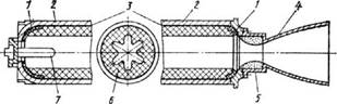 1 - бронирующие покрытия; 2 - корпус; 3 - ТЗП; 4 - сопло; 5 - сопловой вкладыш; 6 - топливо; 7 - воспламенитель