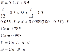 | L, м | B, м | D, м | d, м | CB | CM | V, м3 | , м2