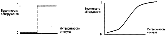 Если сенсорная система работает по дискретному принципу, психометрическая функция будет выглядеть следующим образом. До определенного уровня интенсивности стимула вероятность обнаружения равна нулю, потом – единице (рис. 13).