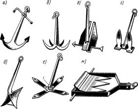 Наибольшее применение на судах нашли якоря Адмиралтейский (с неподвижными лапами), Матросова и Холла (с поворотными лапами).