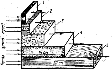 Pис. 11 Сравнительная толщина слоя половинного ослабления гамма лучей для различных материалов 1—свинец 2 —сталь, 3 —бетон, 4 —гоунт, 5—дерево