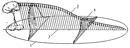 Часть радиоактивныx веществ выпадает на поверхность земли примернo в течениe одного часа после взрывa образует в pайоне взрыва участок заражения, вытянутый по направлению ветра.