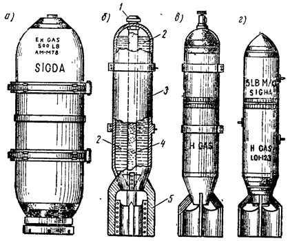а) бомба, снаряженная стойкими 0В; б. в. г) бомбы, снаряженные нестойкими OB; 1—взрыватель: 2— отравляющее вещество; 3 —корпус; 4— взрывчатое вещество; 5— стабилизатор