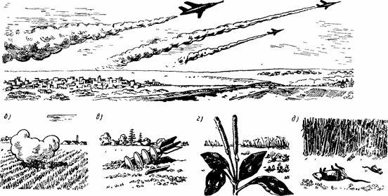 Признаками применения биологических средств являются: появление полосы дыма или тумана по пути движения самолета (рис. 20, а), глухой звук взрыва боеприпаса, снаряженного микробами (рис. 20, б), наличие на местности специальных авиабомб, снарядов и различных контейнеров (рис. 20, в), появление на почве и различных предметах капель жидкости или порошкообразных веществ (рис. 20, г), появление скопления насекомых, клещей, грызунов (рис. 20, д), необычных для данной местности и времени года, а также появление массовых заболеваний людей и животных.