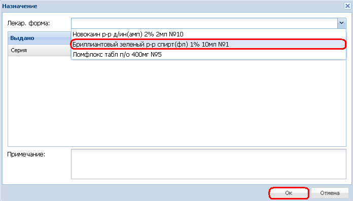 Выбранная лекарственная форма отобразится на панели «Выдано».