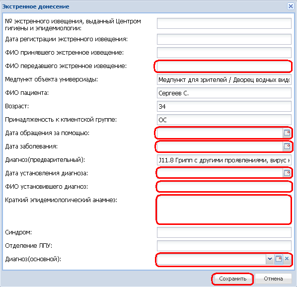 На форме экстренного донесения (Рис. 16) заполните следующие поля: