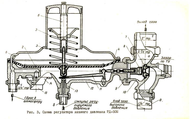Регулятор РД-50М (рис. 3) состоит из крестовины 10, корпуса 12, мембранной камеры и крышки 3. Крестовина имеет два отверстия для входа газа и соединяется с корпусом посредством накидной гайки 9, что да'ет возможность располагать газопровод в любом направлении.