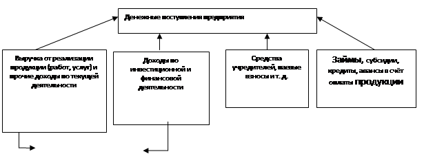 Денежные поступления - это совокупность всех денежных средств, поступающих на счета и в кассу предприятия (рисунок 1). Доходы предприятия - это денежные средства и имущество, поступившие предприятию за определенный период в результате его производственно-хозяйственной деятельности, увеличивающие его активы и дающие предприятию экономическую выгоду. Они различаются по содержанию и источникам образования. В структуре денежных доходов предприятия выручка от реализации продукции (работ, услуг) занимает наибольший удельный вес, она представляет собой денежные средства, получаемые предприятием за отгруженную покупателям продукцию (работы, услуги).