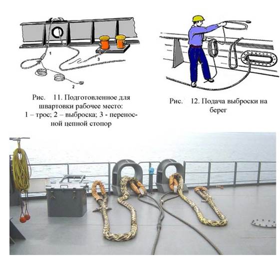 К деталям швартовного устройства относятся также бросательные концы и кранцы. Бросательный конец изготовляют из линя длиной около 25 м. На одном его конце имеется легостъ — парусиновый мешочек, наполненный песком.