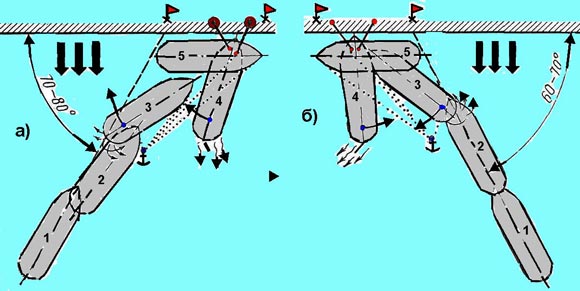 Швартовка при отжимном ветре относительно безопасна. Наиболее трудной частью маневрирования является прижимание кормы к причалу. Способы маневрирования левым и правым бортом не имеют принципиального различия.
