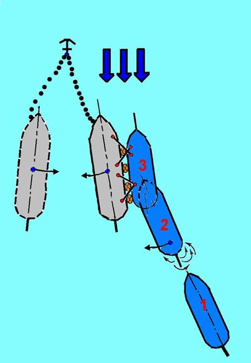 По мере сближения судов маневрируют машиной и рулем так, чтобы погасить инерцию и выйти на параллельный курс как можно ближе к стоящему судну; к этому времени оно будет удаляться от маневрирующего судна, что будет способствовать обеспечению безопасной швартовки без навала или смягчит толчок. При первой возможности подают сначала бросательные концы (взаимно с обоих судов) с носа и кормы, а затем швартовные тросы (положение 3), которые сразу берут на турачку брашпиля и шпиль. При выбирании тросов необходимо учитывать положение корпусов обоих судов и первым выбирать швартов с более отдаленной части судна. Как только суда установятся параллельно, надо одновременно подбирать швартовные тросы. В противном случае обтягивание одного из них приводит к резкому отставанию противоположной оконечности корпуса, вследствие чего неизбежен навал.