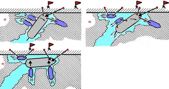 Маневрирование и порядок отдачи якорей при этом такие же, как при швартовке кормой в обычных условиях.