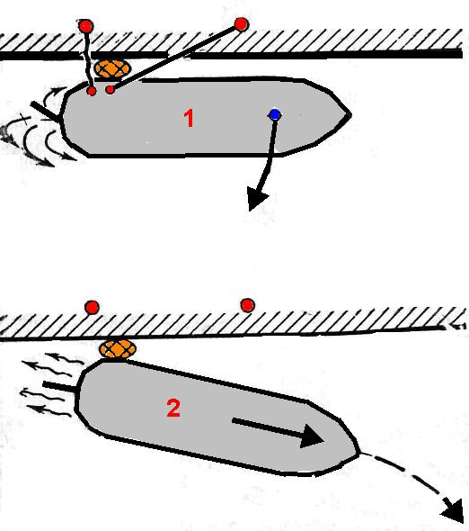 Отшвартовка судна с подруливающим устройством. Отдаются швартовы, руль перекладывается на борт в сторону причала, НПУ включается на работу от причала и дается самый малый передний ход. Под действием боковых сил от руля и НПУ судно практически лагом отходит от причала.
