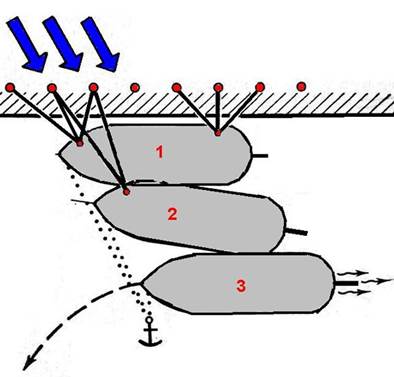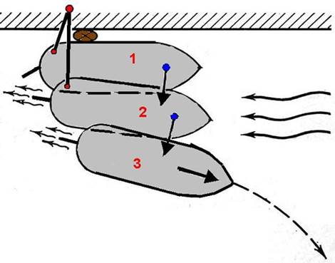 Рис. 56. Отход судна от причала на течении с использованием швартовов и якорного каната