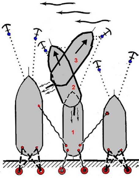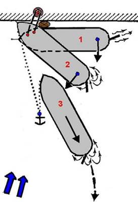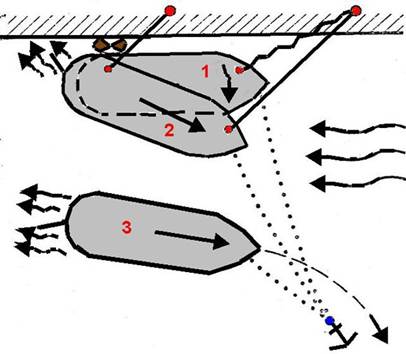 Рис. 54. Отход от причала при прижимном ветре с помощью якоря