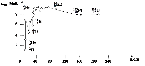 Из графика на рис. 1 следует, что удельная энергия связи максимальна (8,65 МэВ) у ядер с массовыми числами порядка 100. У тяжелых и легких ядер она несколько меньше (например, 7,5 МэВ у урана и 7 МэВ у гелия), у атомного ядра водорода